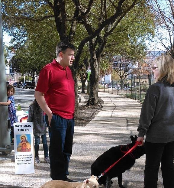 In addition to preaching the Gospel message, the evangelists will engage non-practicing Catholics and non-Catholics who are on the sidewalk, by giving them sacramentals and praying with them for various needs, including physical/emotional healing, family, work and other issues. All receive cards with Mass times at the local parish, The Church of the Annunciation, or the CCC, where many Spanish speakers are encouraged to visit. We are so grateful that God uses us, His energetic army of believers, to spread His message of hope and joy.