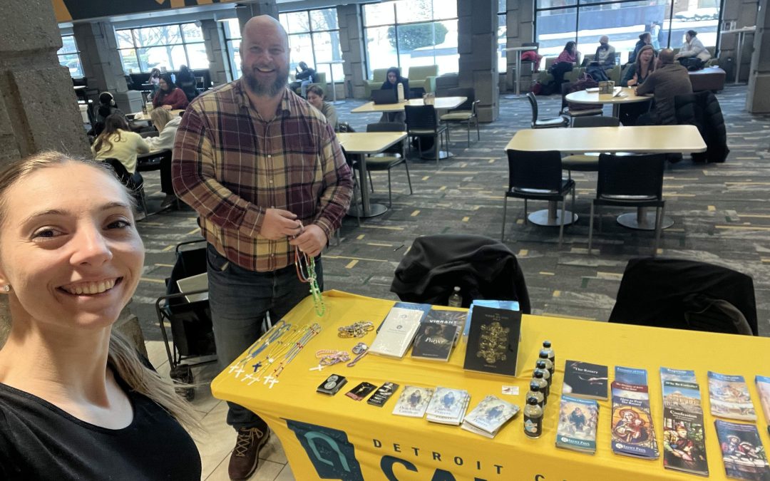 Staff from the National SPSE office were invited to evangelize at Wayne State University in Detroit, partially with the intent to invite students to the nearby Catholic campus ministry. Lexa and I went to the Student Center this past Tuesday afternoon and found our table in the middle of the building.